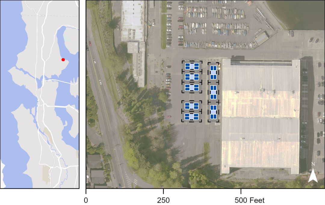 Conceptual design of pickleball courts in a parking lot west of Arena Sports in Magnuson Park. This site is already paved, close to restrooms and other amenities, and would have less impact on wildlife habitat and nature experience.