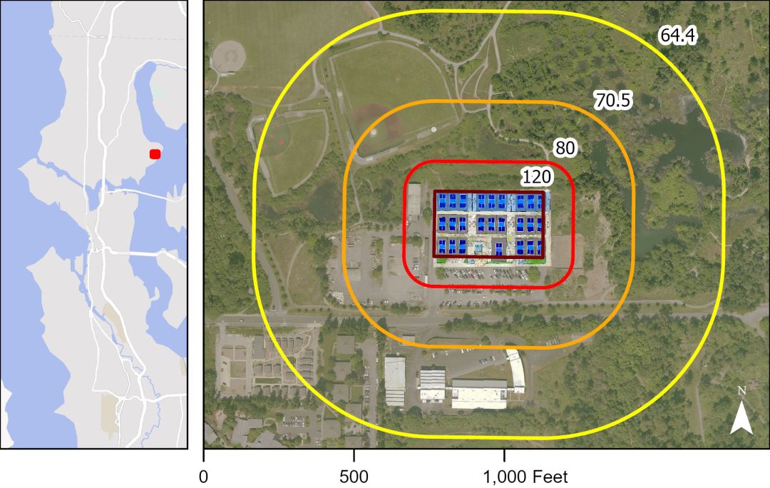 Idealized attenuation of peak sound levels from pickleball, which can reach 120 decibels courtside (darkest red). Under ideal conditions, sound levels decrease proportional to the inverse square of distance from the source. Sound levels would be 80 decibels 100 away from the court, 70.5 decibels 300 feet from the court, and 64.4 decibels 600 feet from the court – still more than 2.7 times louder than typical background residential noise.