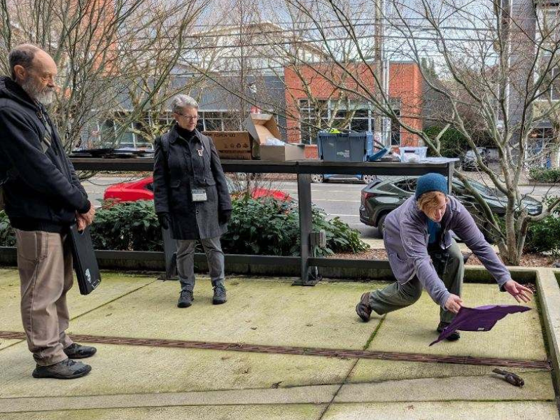 Ser trains Seattle Bird Collision Monitoring Project volunteers on what to do if they encounter a dead or injured bird during their volunteer service.Â
